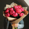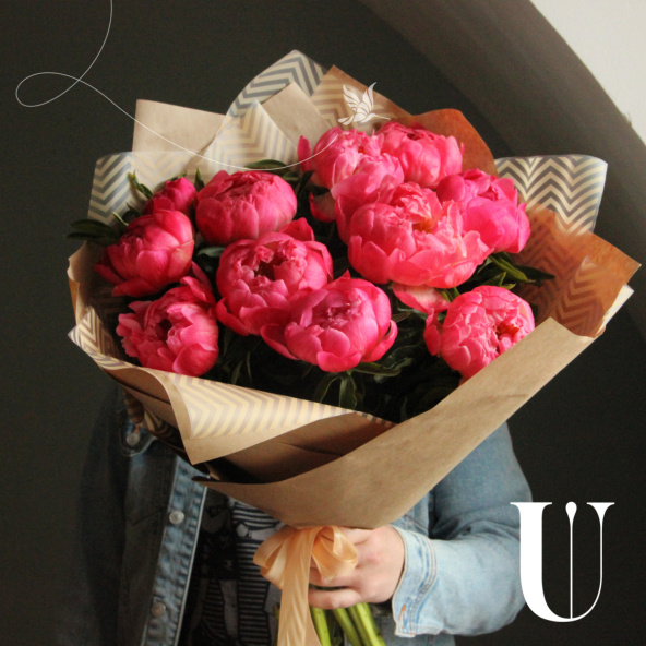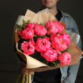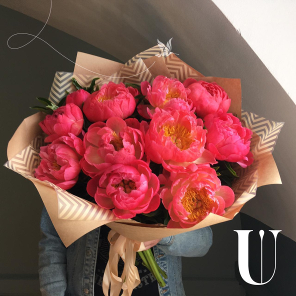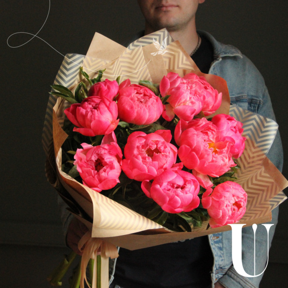 Роскошный букет из 11 кораловых пионов, в лаконичной упаковке