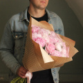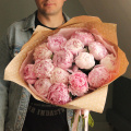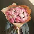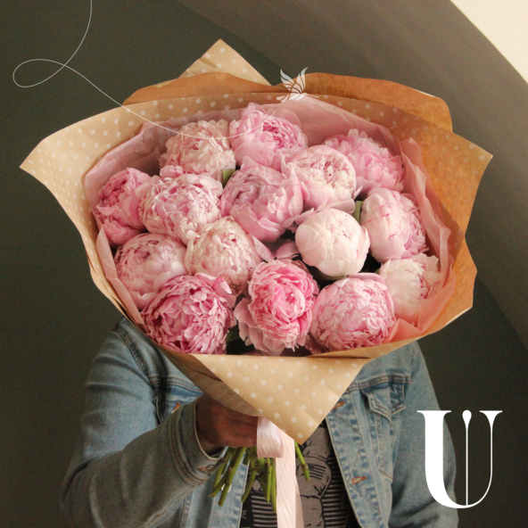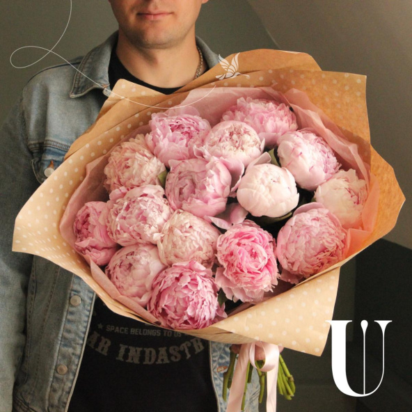 Нежный букет из 15 розовых пионов, в лаконичной упаковке.