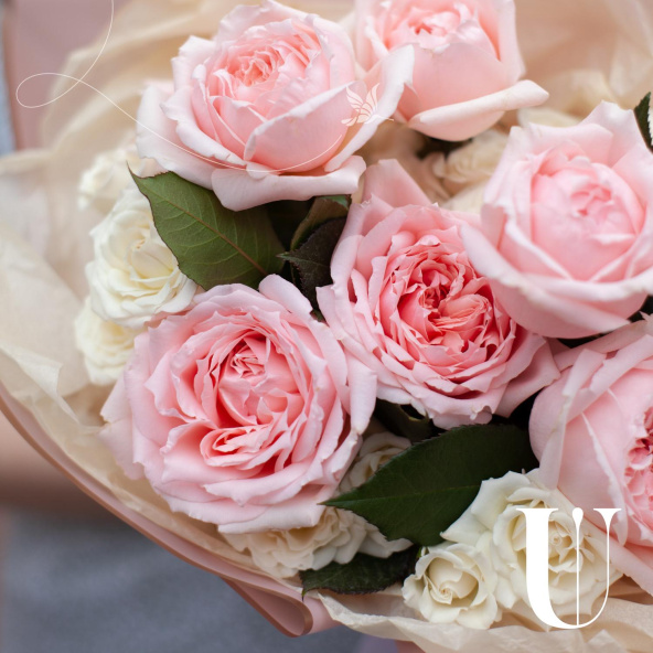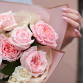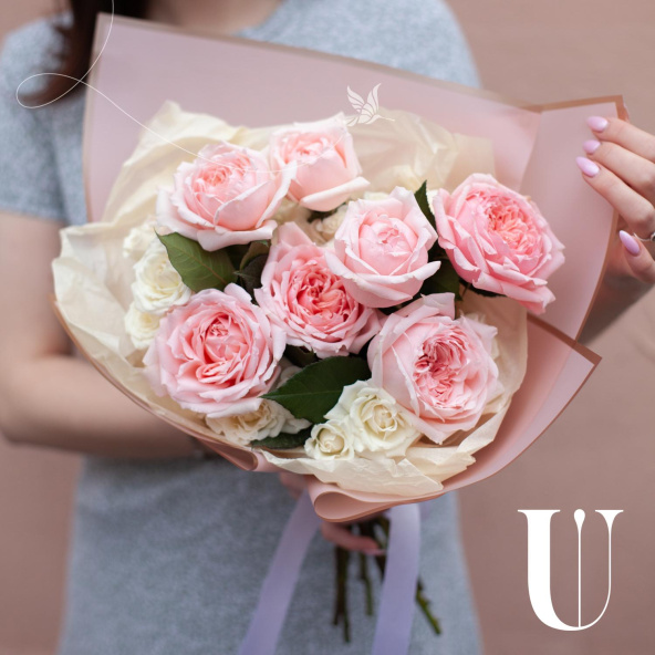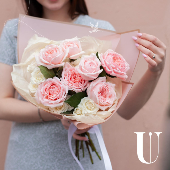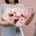 Монобукет из нежно-розовых кустовых пионовидных роз в белой упаковке