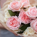 Букет из ажурных французских розовых роз в упаковке из матовой пленки и бумаги тишью