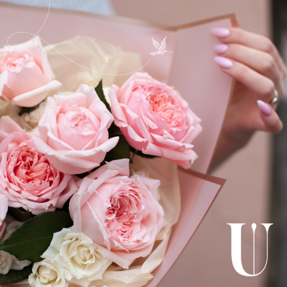 Монобукет из розовых кустовых пионовидных роз в дизайнерской упаковке