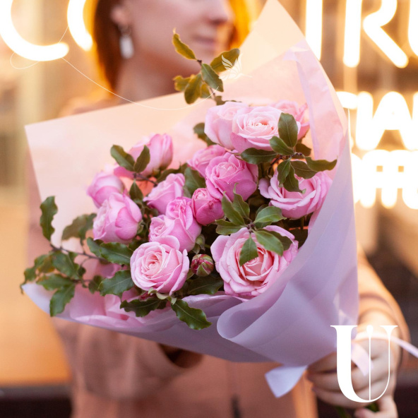 Нежная композиция из пионовидных роз в дизайнерской упаковке