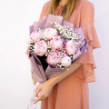 Букет из пионовидных роз Мандарнин Экспрешн и кустовых роз Джульетта в упаковке