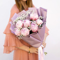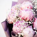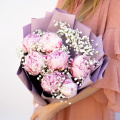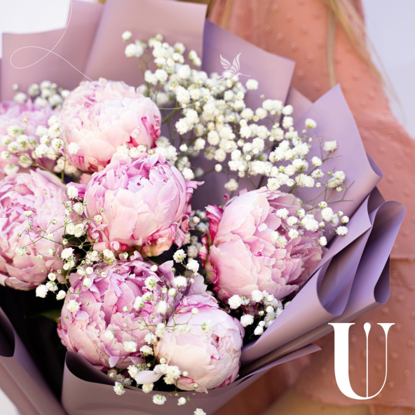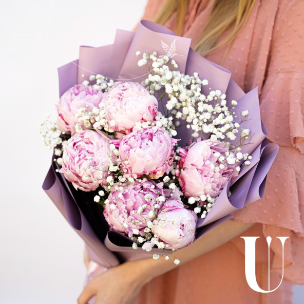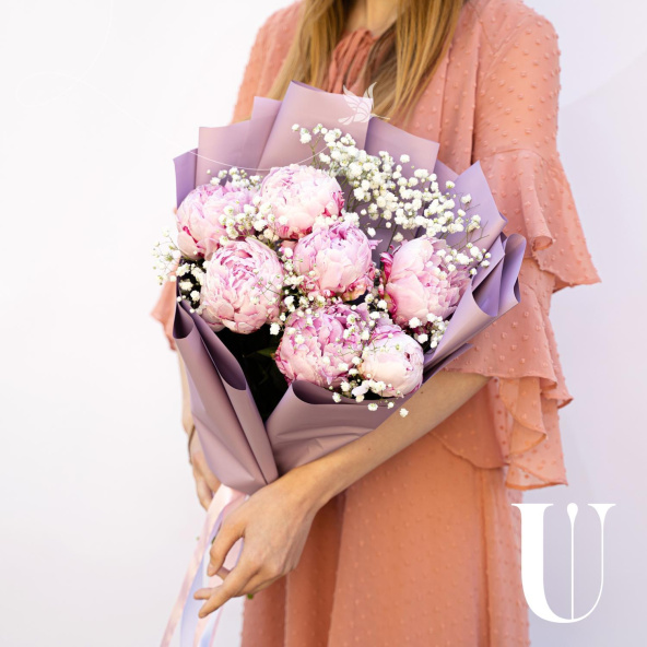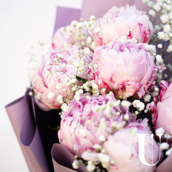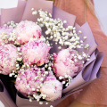 Букет в розовой цветовой гамме с пионами и гипсофилой