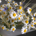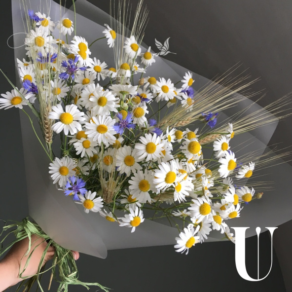 Букет из 15 кустовых ромашек, васильков и ржи.