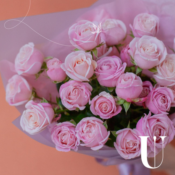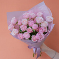 Монобукет из пионовидных роз Кахала и лимониума в нежной упаковке