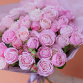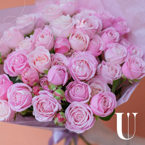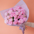 Монобукет из кустовых пионовидных роз сорта Бомбастик в дизайнерской упаковке