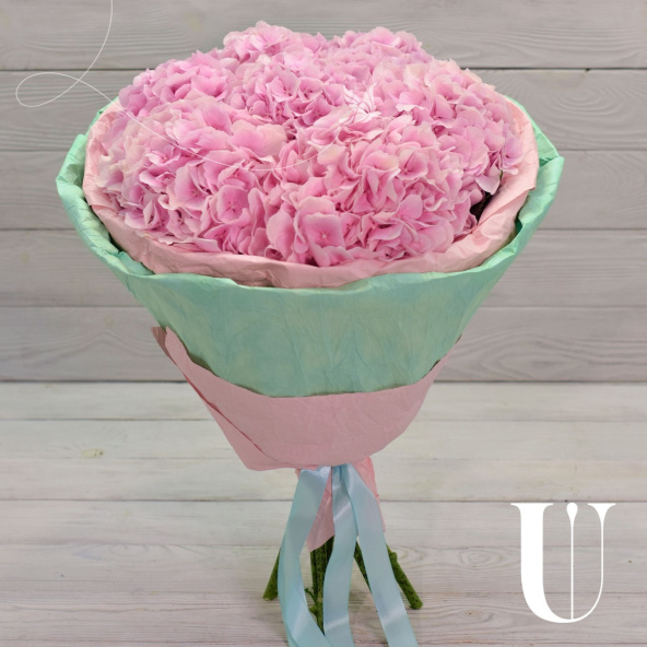 Эффектный букет из огромных шапок розовой гортензии в стильной мятной упаковке