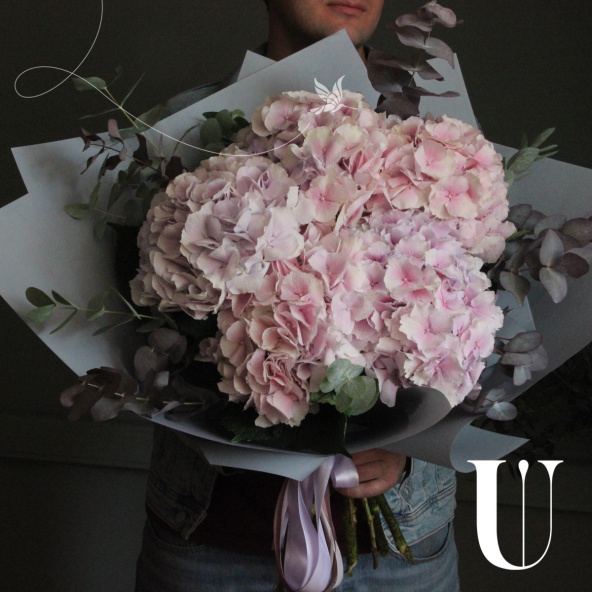 Букет из 5 гортензий, с веточками эвкалипта, в лаконичной упаковке.