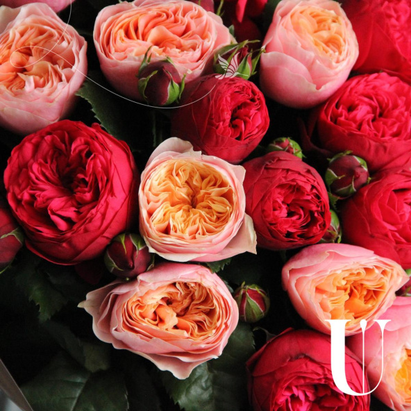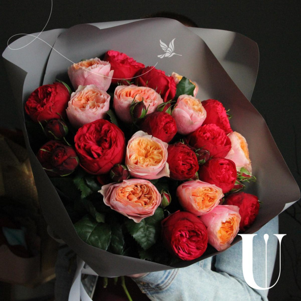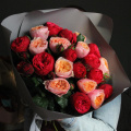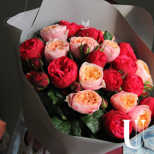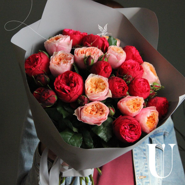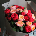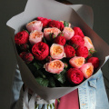 Букет из клубничных и персиковых пионовидных роз, в лаконичной упаковке. 21 штука.