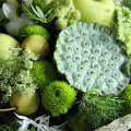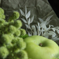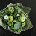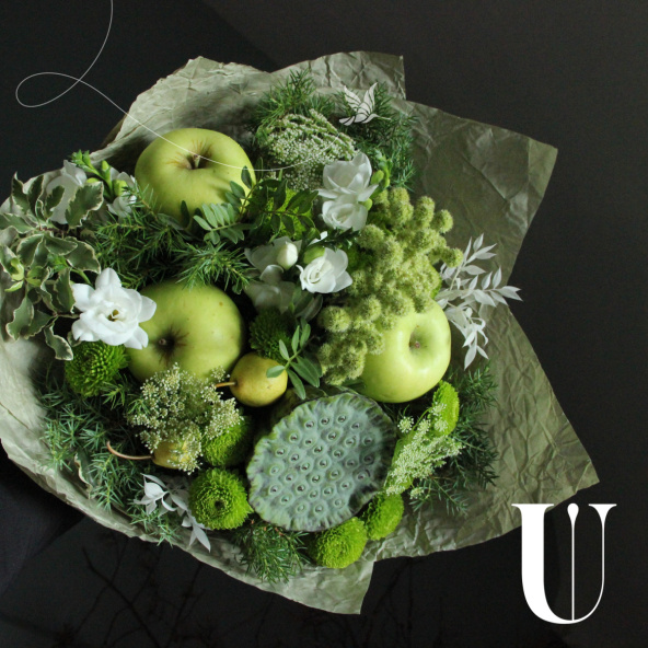 Нестандартный букет с яблоками, лотосом, фрезией, амарантом и можжевельником