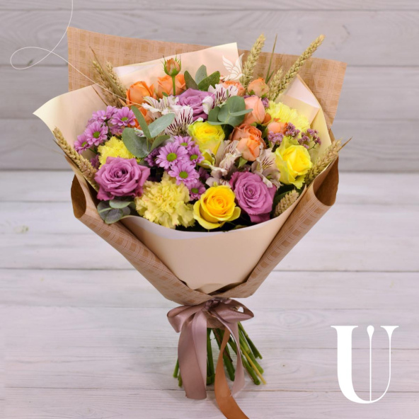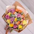Роза желтая - 3 шт., роза сиреневая - 3 шт., роза кустовая - 2 шт., альстромерия белая - 3 шт., диантус желтый - 3 шт., сантинии - 2 шт., лимониум, эвкалипт, колосья
