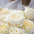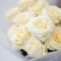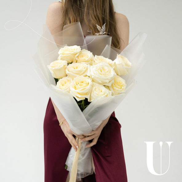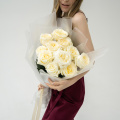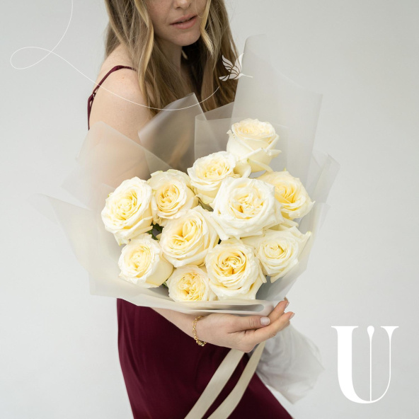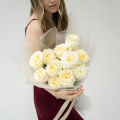 Монобукет из шикарных пионовидных роз в легкой полупрозрачной упаковке