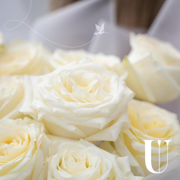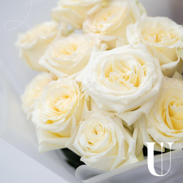 Букет из белых роз и лимониума в дизайнерской упаковке