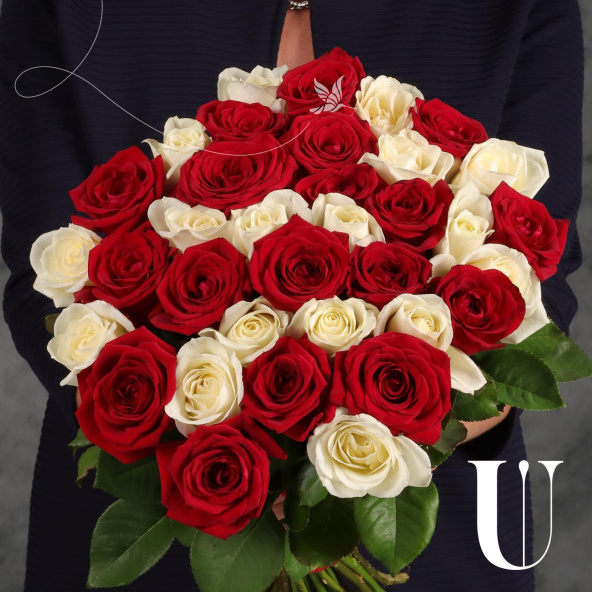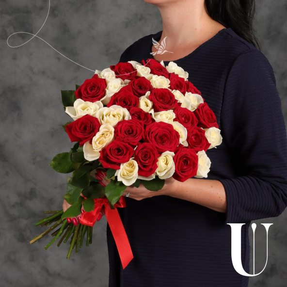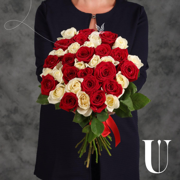 Монобукет из роз Готча и роз Пинк Мондиаль в дизайнерской упаковке