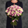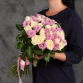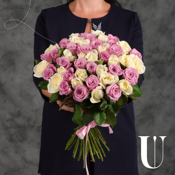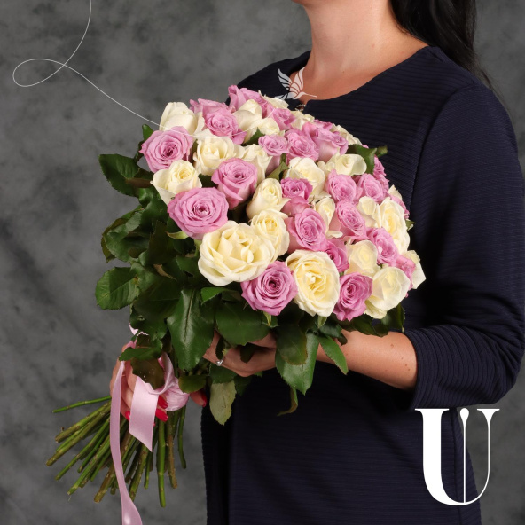 Монобукет из розовых и белых пионовидных роз в дизайнерской упаковке