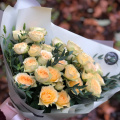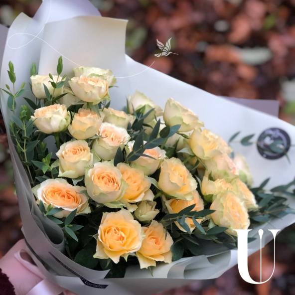 Монобукет из 7 роз сорта Капучино и эвкалипта в дизайнерской упаковке