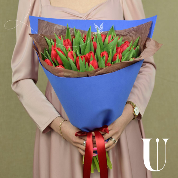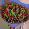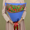 Монобукет из алых роз сорта Нина 60 см в упаковке