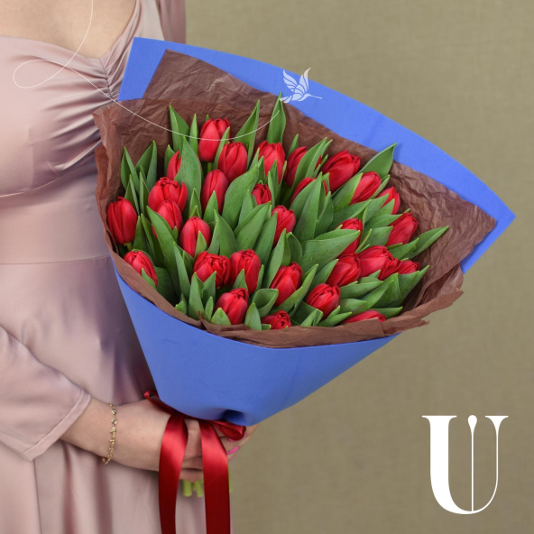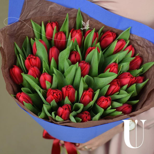 Букет из 11 красных роз сорта Ред Наоми в стильной упаковке фоамиран