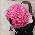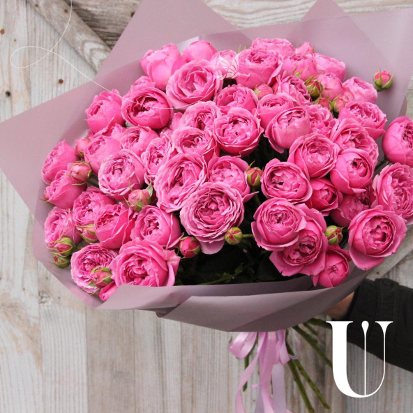 Монобукет из нежных и розовых кустовых роз в дизайнерской упаковке