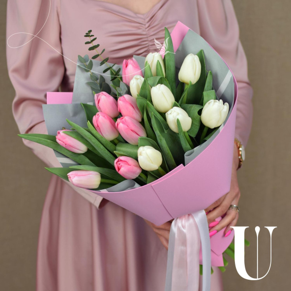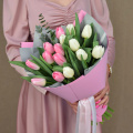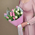 Букет из розовых гортензий и белых тюльпанов в розовой упаковке