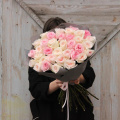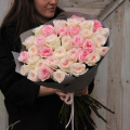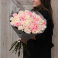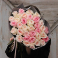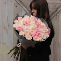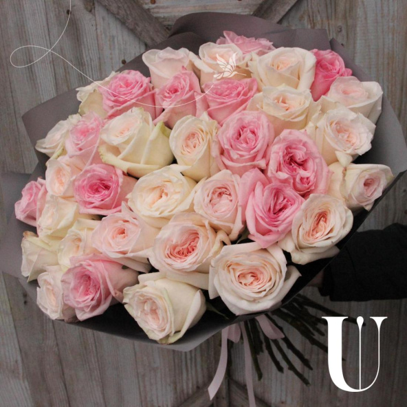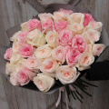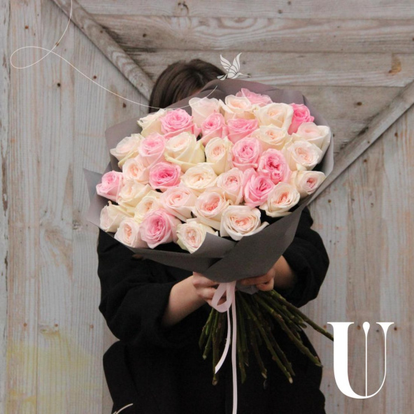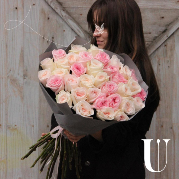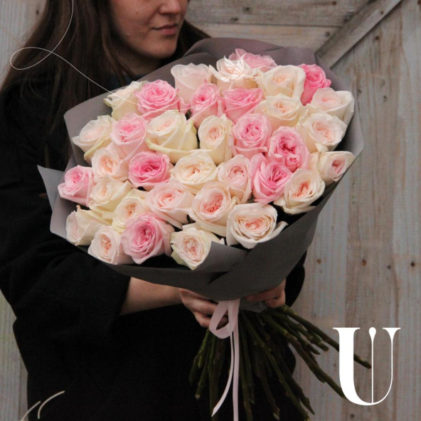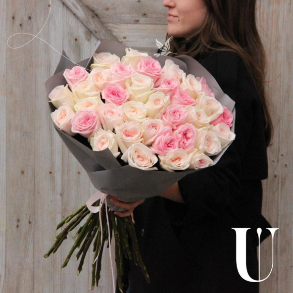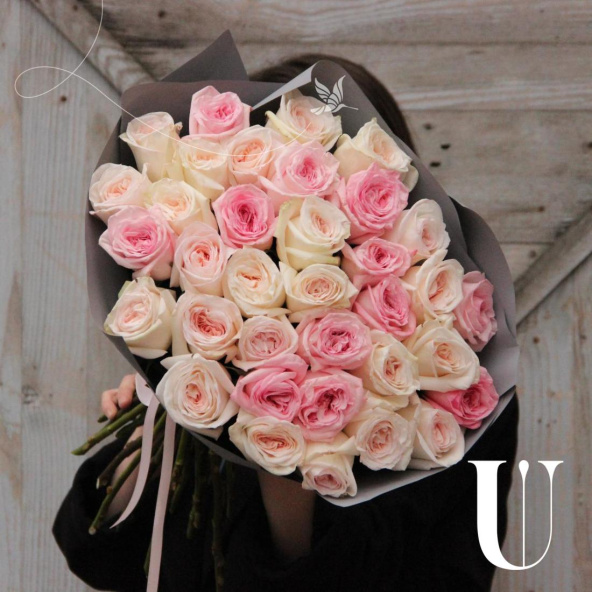 Моно букет из 35 ароматных, пионовидных роз в лаконичной упаковке.