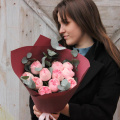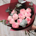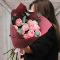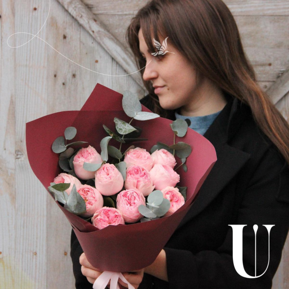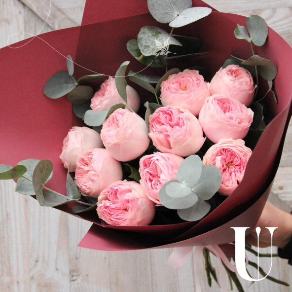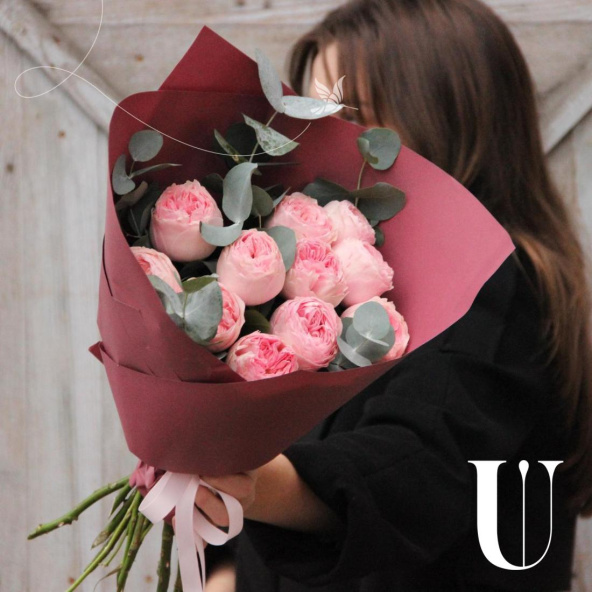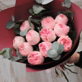 Моно букет из 11 пионовидных роз с веточками ароматного эвкалипта