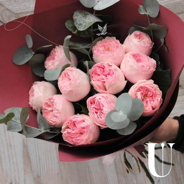 Моно букет из 11 пионовидных роз с веточками ароматного эвкалипта.