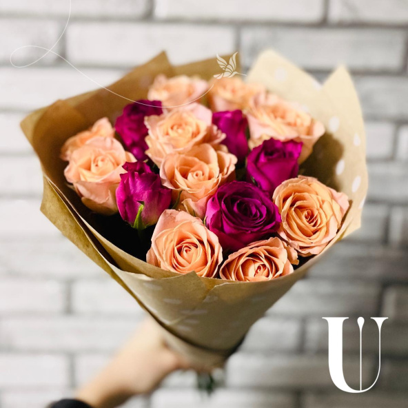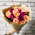 Букет микс из розовых и персиковых роз в крафтовой упаковке