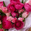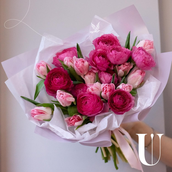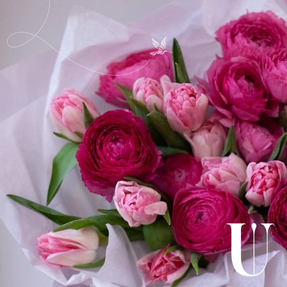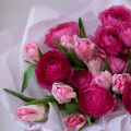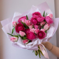 Монобукет из малиновых роз и оранжевого лагуруса в упаковке