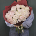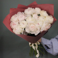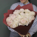 Букет из розовых, белых и кремовых роз в упаковке с газетным принтом