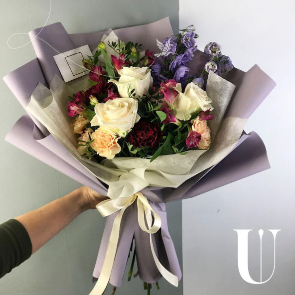 Сочный букет с французскими розами и красными альстромериями в упаковке