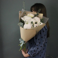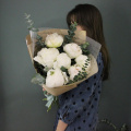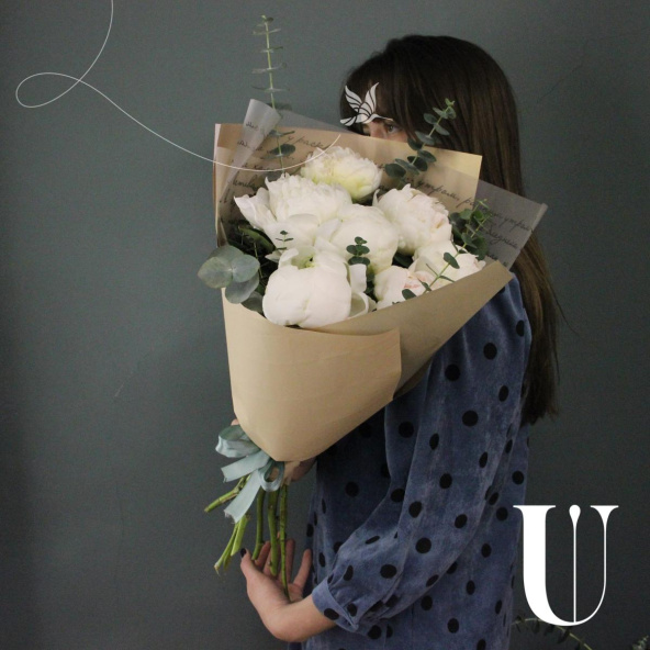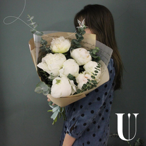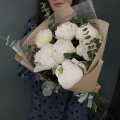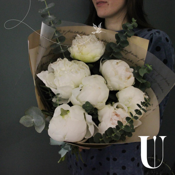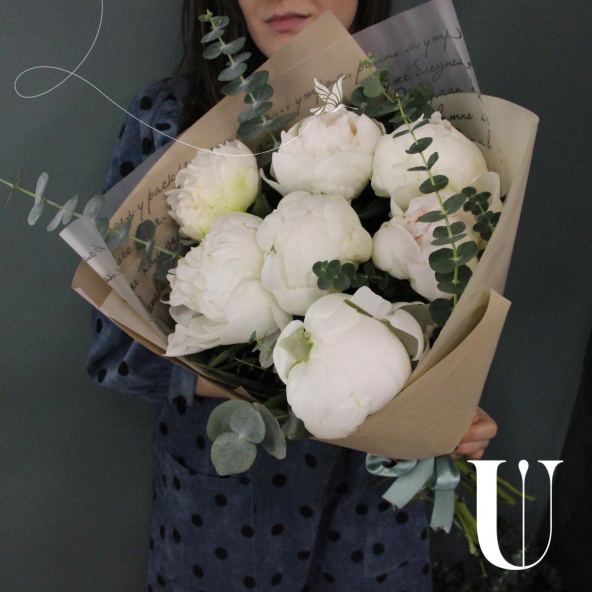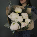 Сливочный букет из 7 пионов и веточками ароматного эвкалипта в лаконичной упаковке.