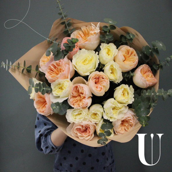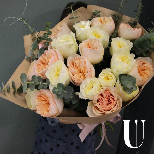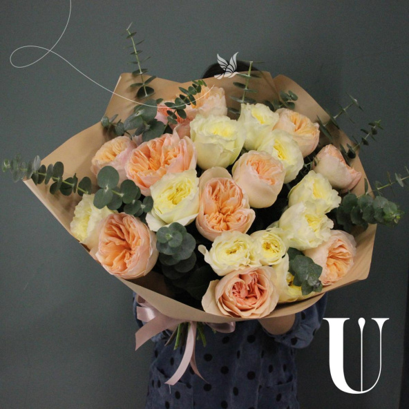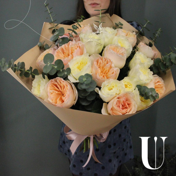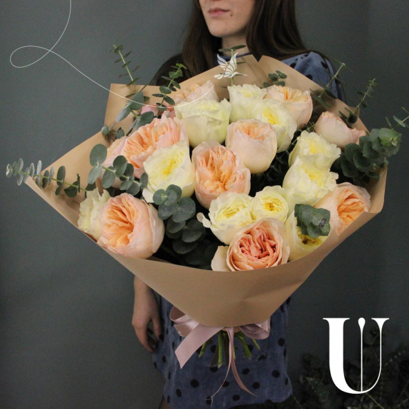 - Восхитительный букет из 21 пионовидной розы с веточками ароматного эвкалипта