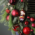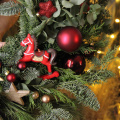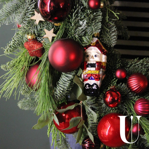 Оформлен стеклянным щелкунчиком и разнообразными шарами, деревянными позолоченными звездочками и лошадкой