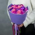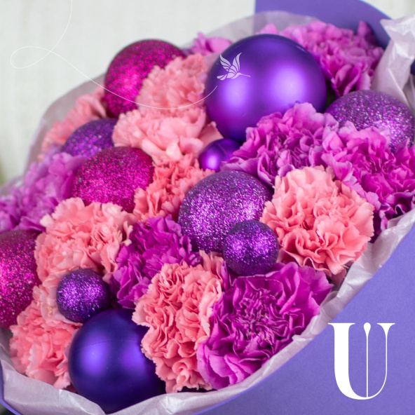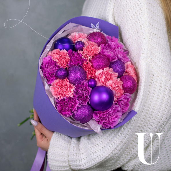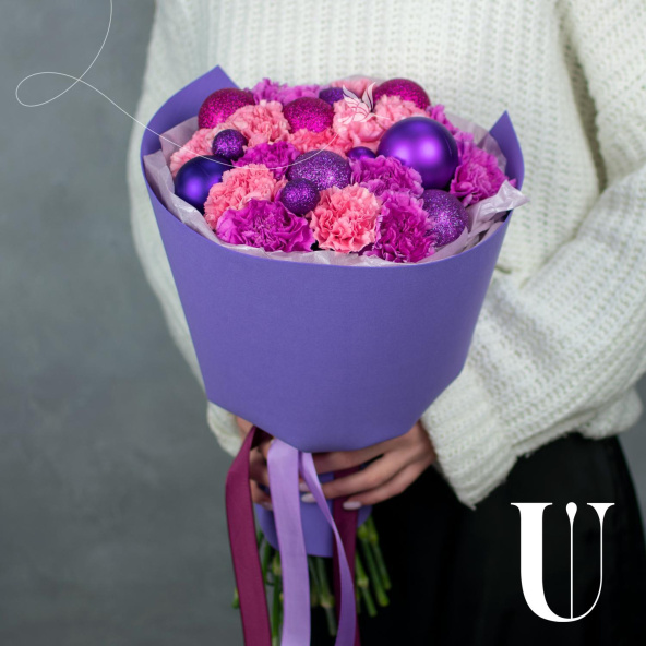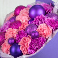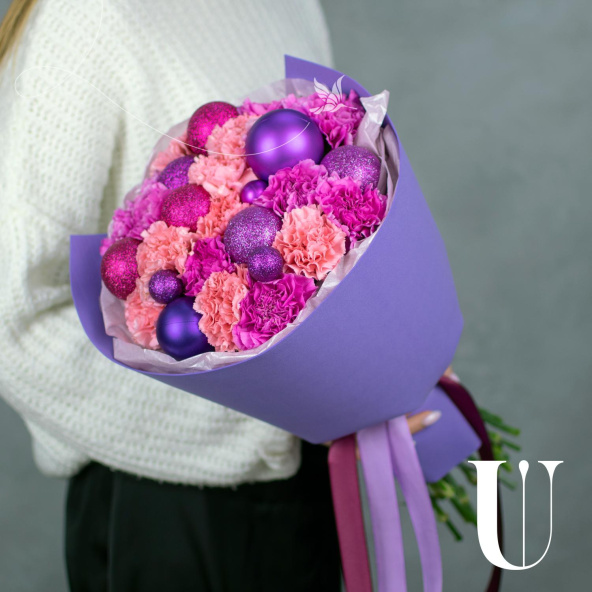 Букет в розово-сиреневых тонах из диантусов и новогодних шаров