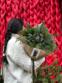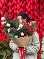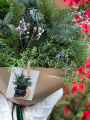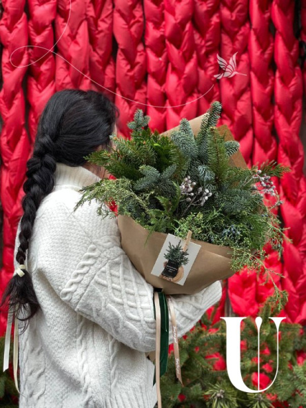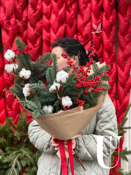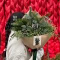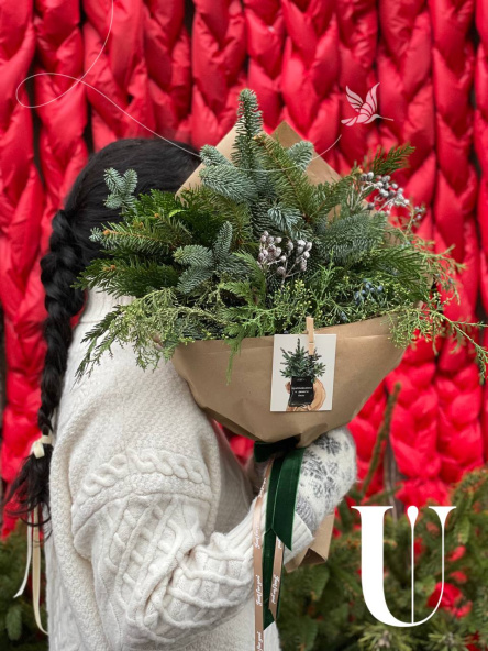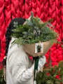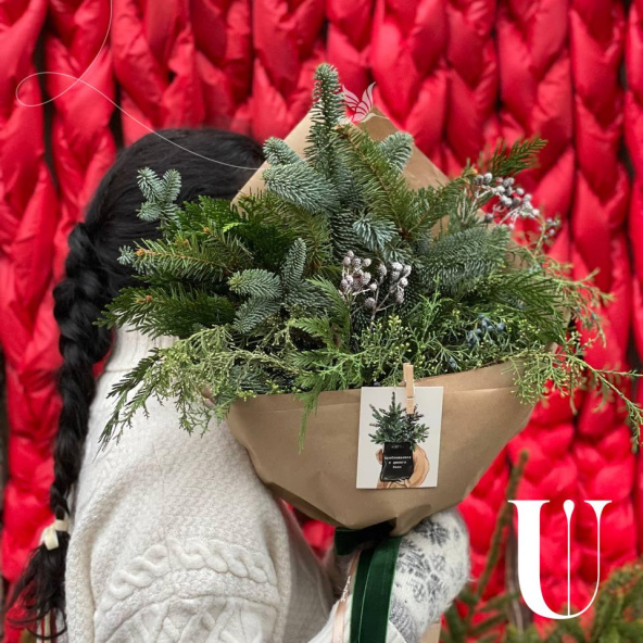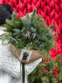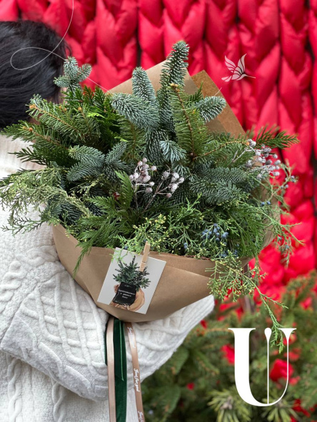 Букет включает в себя нобилис, ароматный можжевельник и кипарис, создавая гармоничную композицию природных оттенков. Он упакован в крафтовую упаковку, дополненную бархатной лентой, придавая букету еще больше нежности и утонченности. Этот букет идеально подойдет как подарок для особого человека или для создания уюта и праздника в доме или офисе.