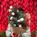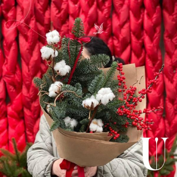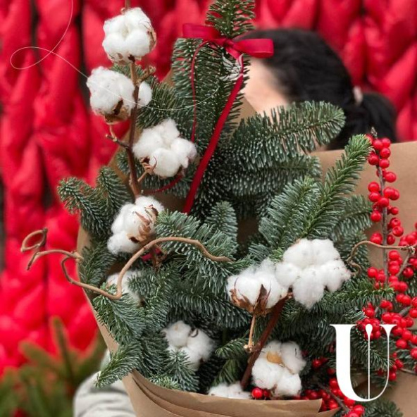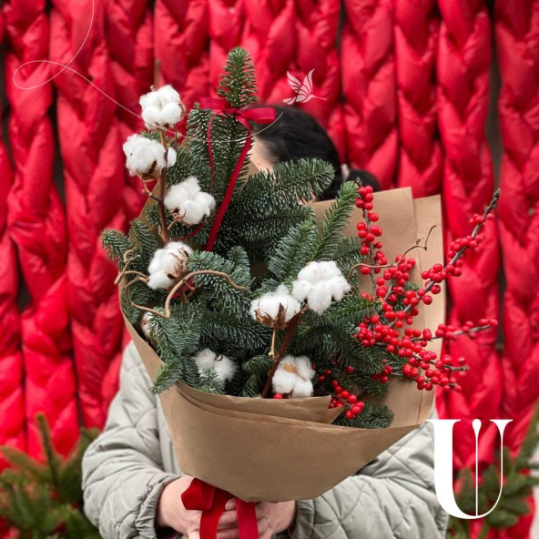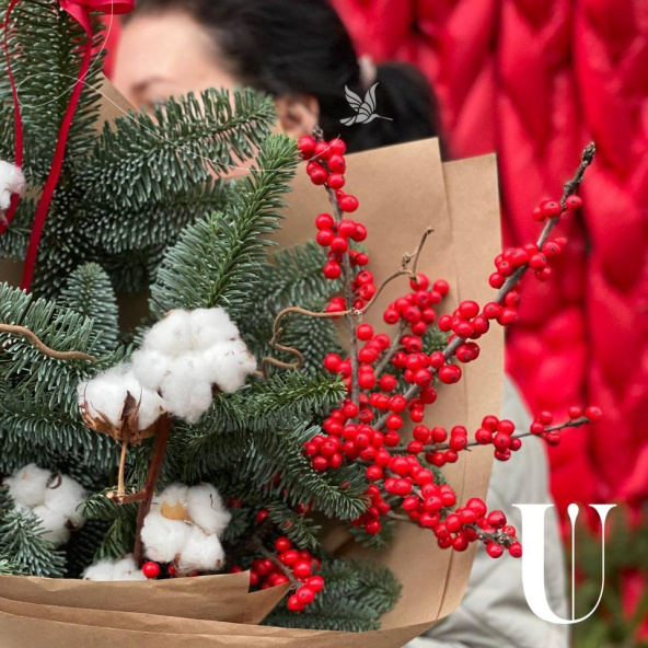 Яркий интерьерный букет с илексом, хлопком и хвоей! Упакован в крафт.