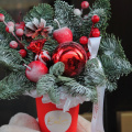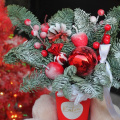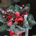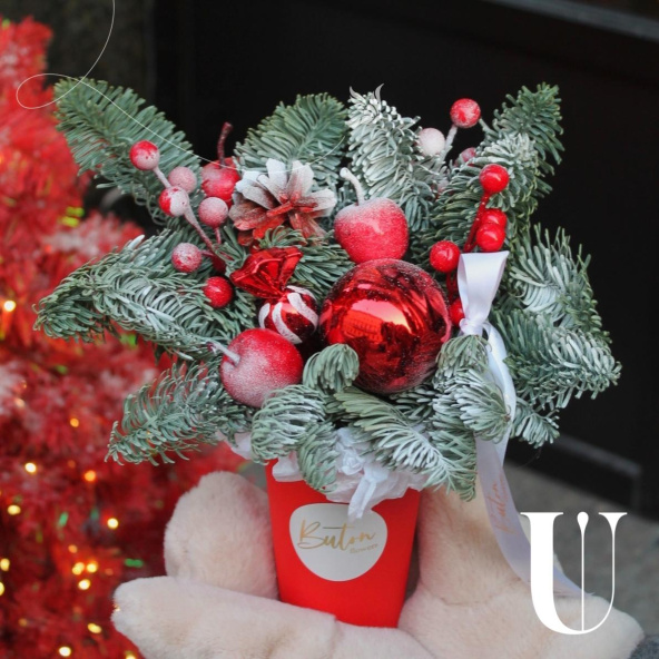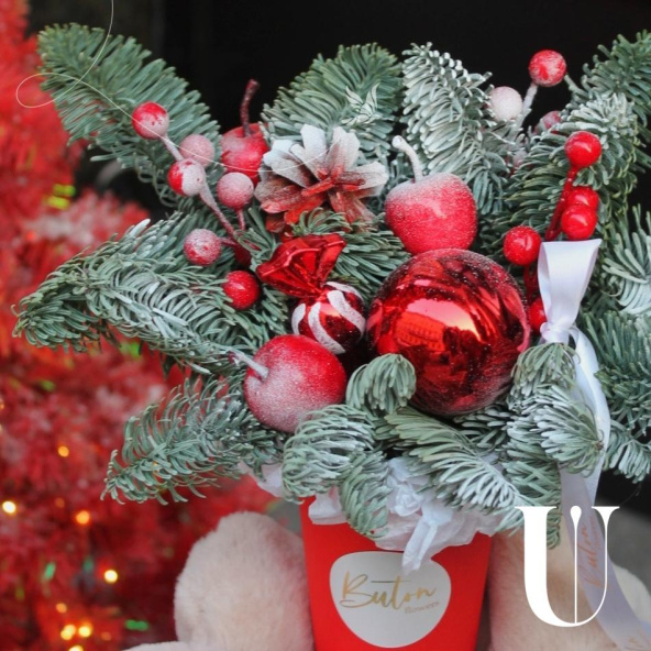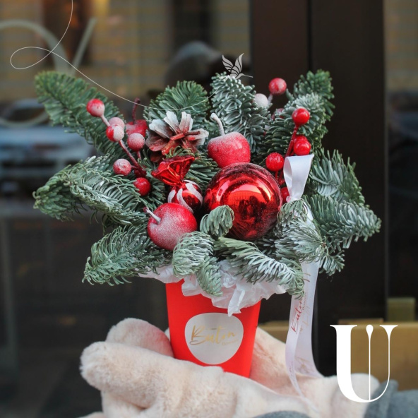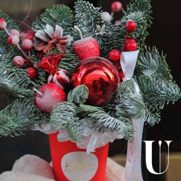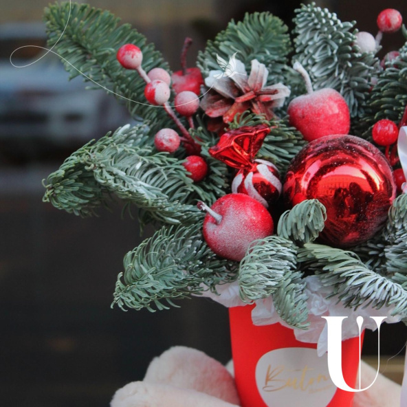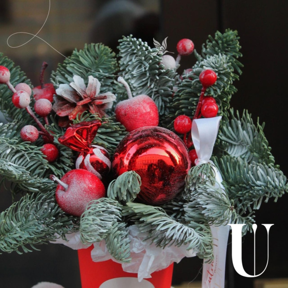 Новогодняя композиция - волшебный зимний подарок ,наполненный атмосферой уюта и тепла. Композиция из свежих хвойных веток нобилиса и новогоднего декора ,ярких красных ягод и игрушек, создают идеальный баланс между природной красотой и праздничной атмосферой.