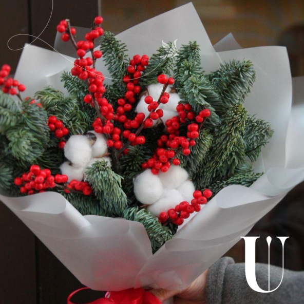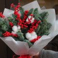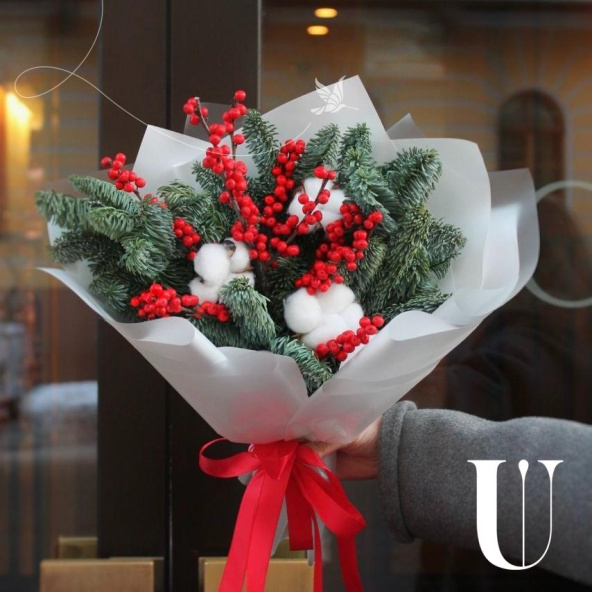 Новогодняя композиция - волшебный зимний подарок ,наполненный атмосферой уюта и тепла. Композиция из свежих хвойных веток нобилиса и новогоднего декора ,ярких красных ягод и игрушек, создают идеальный баланс между природной красотой и праздничной атмосферой.