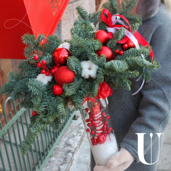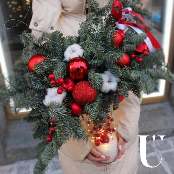 Изысканный букет природной свежести. Основу композиции составляет ароматный голубой нобилис ,придающий букету воздушность и лёгкость. Дополняет его изысканный илекс с яркими ягодами, добавляя контраста и завершенности. Завершающим элементом является мягкий хлопок ,создающий ощущение уютной теплоты.