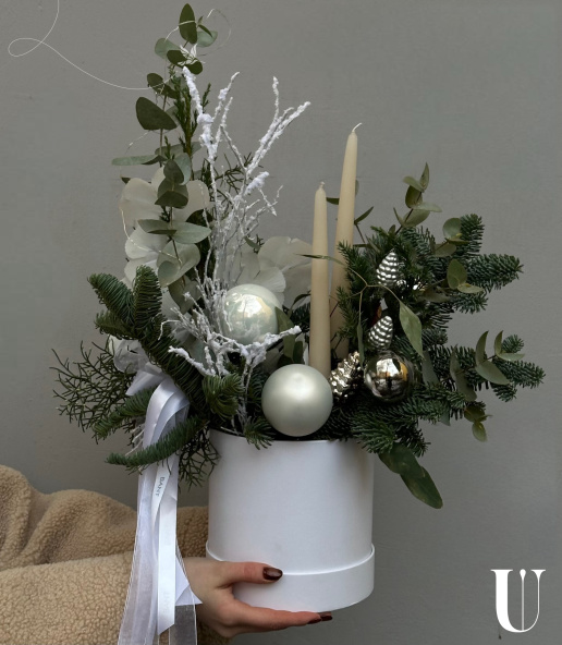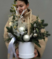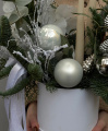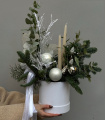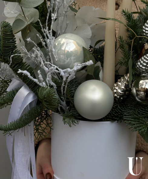 Снежное волшебство: Изысканные игрушки в нежных пастельных тонах расположены среди легких пушистых веток нобилиса на флористической губке. Эта работа передает атмосферу зимней сказки и безмятежности.