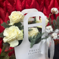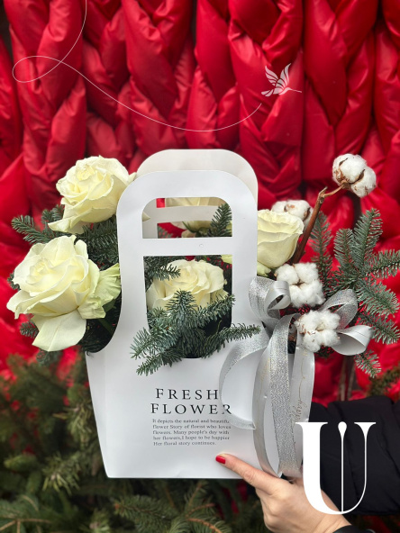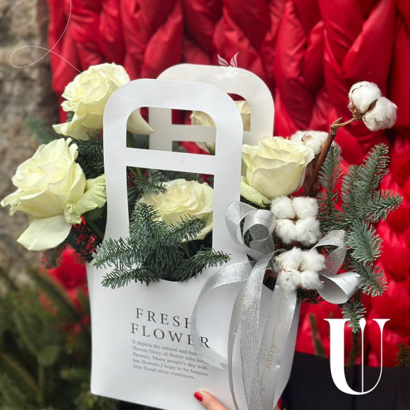 Этот нежный и изысканный букет представляет собой сочетание изящных роз мондиал, великолепных нобилисов и мягкого хлопка. Он выглядит очень стильно и изысканно в своей упаковке в виде сумочки. Подарите этот букет особенному человеку и он наверняка порадует его своей изысканностью и неповторимой красотой.