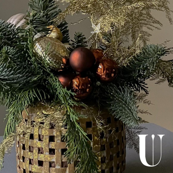 Оригинальная композиция из нобилиса с игрушками ручной работы. Каждый элемент уникален, что придаёт вашему празднику особую индивидуальность.