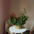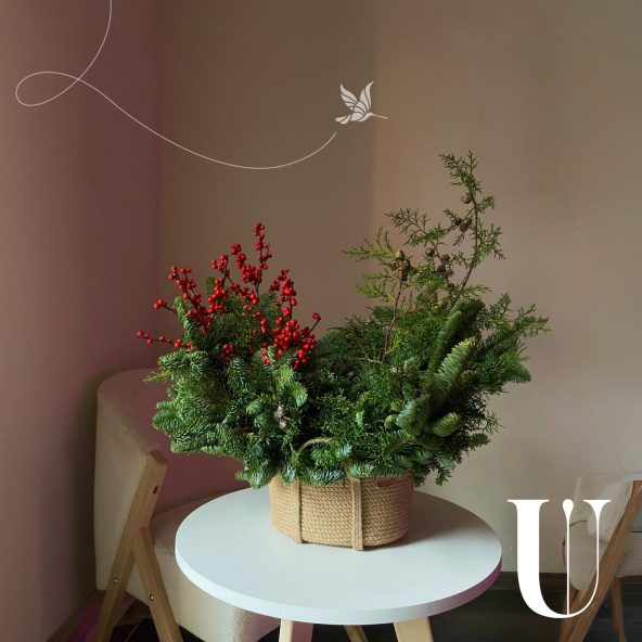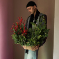 Композиция из нобилиса, красных ягод и новогодних шаров