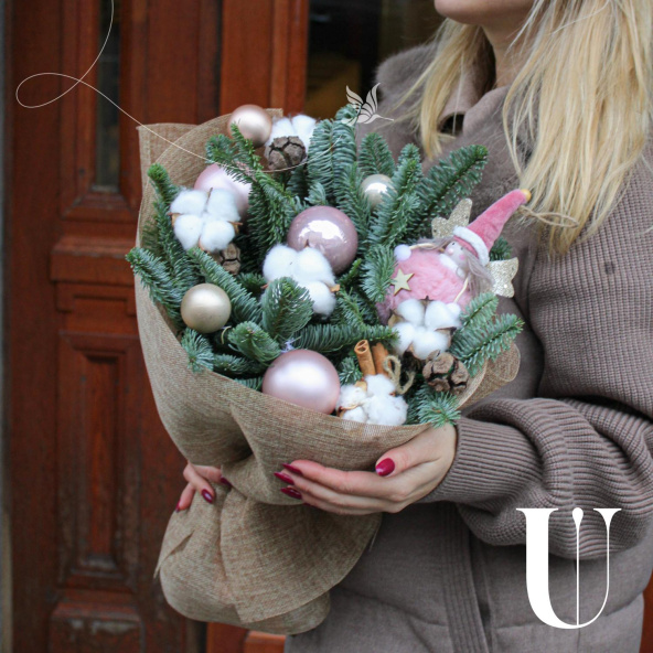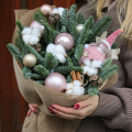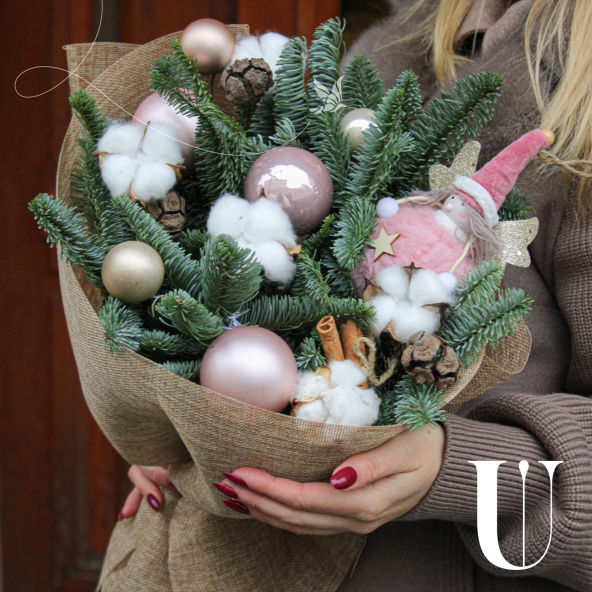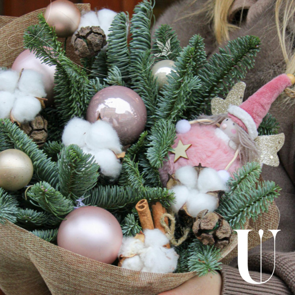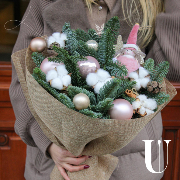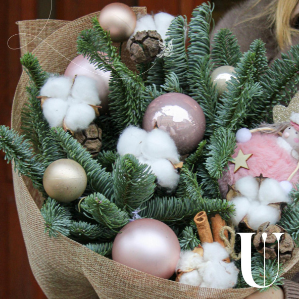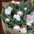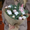 Эффектная новогодний букет из Датской пихты (нобилиса), новогодних шаров и игрушек станет идеальным украшением вашего дома или офиса, а также отличным подарком для Мамы, Сестры, Коллеги, Любимой девушки или близкого человека на Новый год, Рождество, День Рождения, Юбилей или просто для создания праздничного настроения