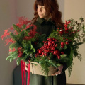 Состав: джутовая корзина размера L, красный аспарагус, ветки кипариса, нобилис, декор.