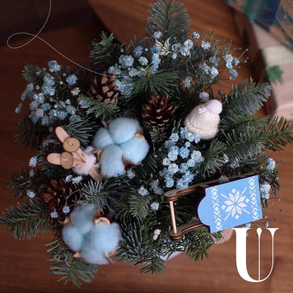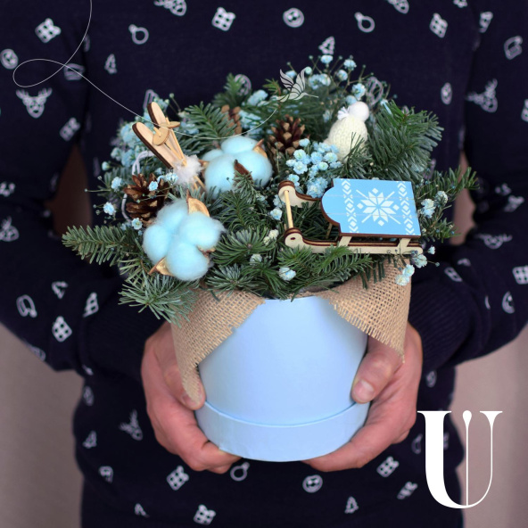 - Круглая коробка с зимней хвойной композицией