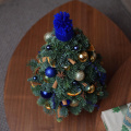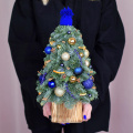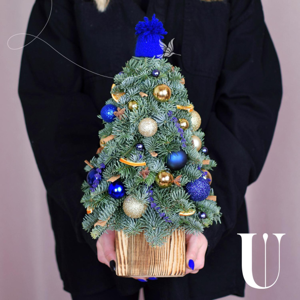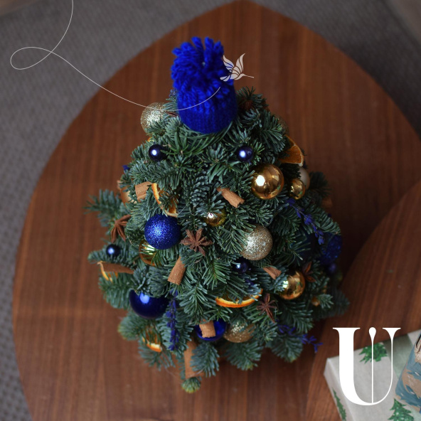 Ёлочка украшена синими и золотыми шарами, звёздочками аниса, сушеными дольками апельсина и вязаной шапочкой