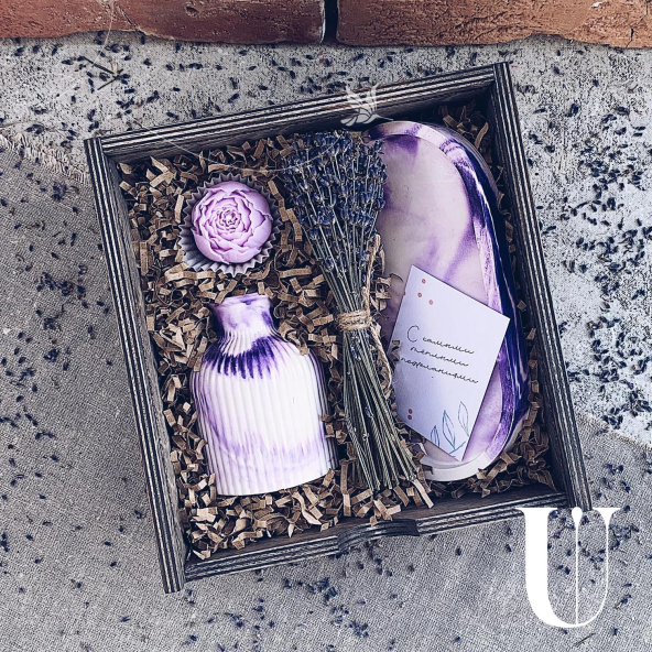 Изящная ваза в нежном оттенке лаванды станет идеальным украшением для вашего дома. Наполните пространство успокаивающим и расслабляющим ароматом свечи. Букет лаванды привнесет в ваш дом частичку крымской природы. Используйте поднос в качестве стильного элемента декора. Выразите свои чувства с помощью нашей элегантной открытки.